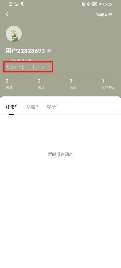 3、然后在个人主页,头像的下方就可以看到自己阅读了多少本书,还有阅读时长。