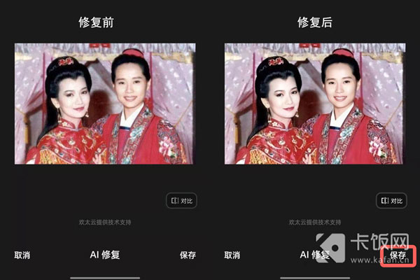 5、长按【对比】按钮查看老照片修复前后的区别,点击【保存】按钮保存修复后的老照片。