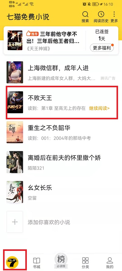 3、如果是书架中的小说,我们就需要在书架界面中点击打开小说;