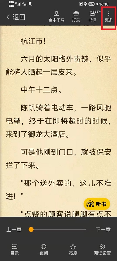 2、在小说界面中,我们需要点击中间位置,就可以让小说相关功能设置出现,然后我们需要点击右上角的【更多】;