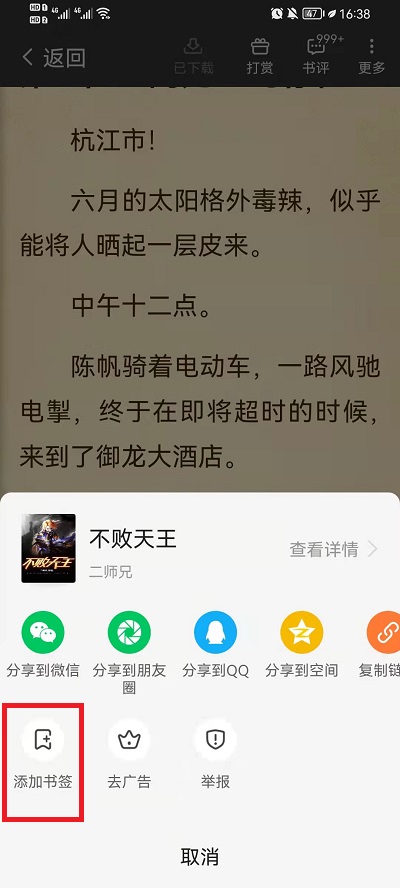 3、然后会弹出来我来教你渠道还有【添加书签】,我们需要点击左下角的【添加书签】设置书签,设置书签的时候,小说内容页面需要调整到自己想要设置书签的页面内容上,因为设置书签是设置当前页面内容;