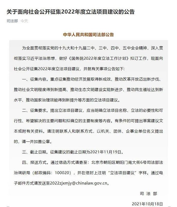 除了可以通过信函的方式进行反馈建议之外,还可以将自己对动物保护法立法的建议、看法以电子邮件的方式即送,主题仍然是“立法项目建议”,将其发送至电子邮箱地址“2022zjxmjy@chinalaw.gov.cn”。