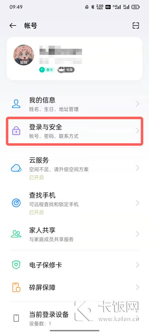1、打开oppo手机上的【设置】点击上方的【账号】进入,再点击【登录与安全】进入账号安全设置;