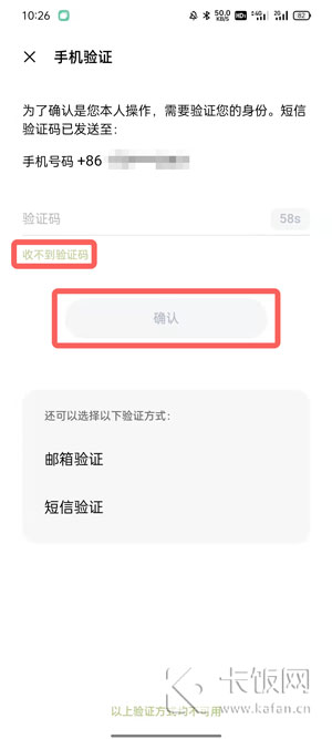 4、输入手机号码或者邮箱账号接收到的验证码,输入后点击【确认】;