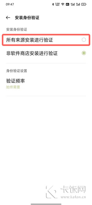5、如果你的手机在安装应用时需要账号密码全新,在步骤三点击【安装身份验证】,选择【所有来源安装进行验证】即可。