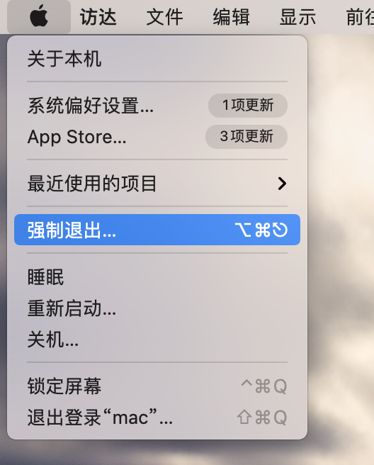 )在 MacOS 桌面的左上角,然后选择“强制退出...”如下所示。您可能需要先单击桌面上的某个位置(或无响应应用程序以外的其他应用程序的窗口)才能先切换到“访达”,因为如果无响应的应用程序仍然是活动应用程序,有时您可能无法选择苹果菜单。