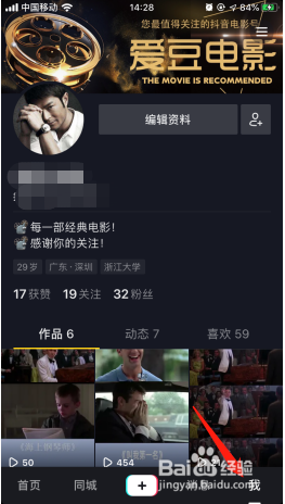 2、找到我的个人主页,这里展示的是个人作品、动态、喜欢的视频列表