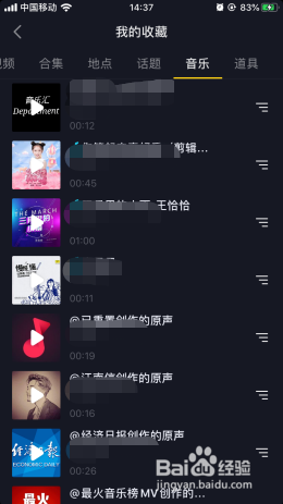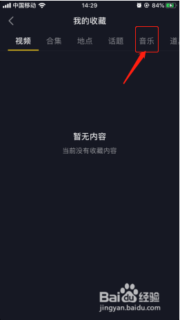 5、收藏列表包含视频、合集、地点、话题、音乐等等,点击音乐列表查看即可