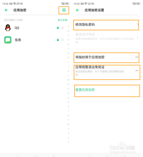 4、在完成【应用加密】设置后的页面,点击屏幕右上角的【设置】图标,可根据需要【修改隐私密码】/【将指纹用于应用加密】/【应用短暂退出免验证】/【重置应用加密】。