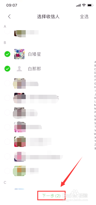 7、在页面中选择好需要发送的收信人,点击“下一步”。