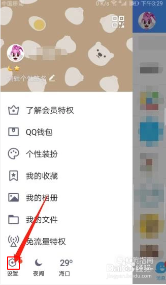 2、这时会跳出一个QQ页面,上面有QQ钱包,个性装扮,我的相册的,接下来选择左下角的设置。
