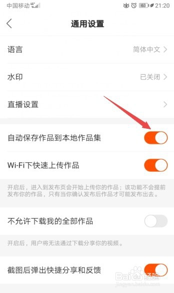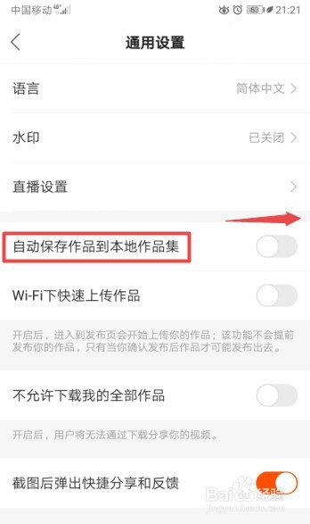 5、之后将自动保存作品到本地作品集的滑动按钮向右滑动。