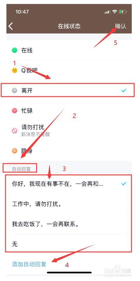 6、选择离开状态,并在自动回复选项里,自行选择,或者添加自动回复并点击确定。