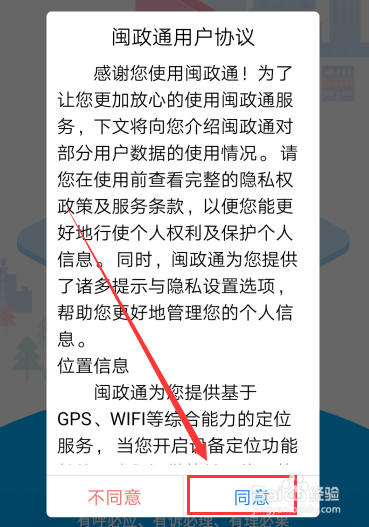 2、打开闽政通,用户协议点击“同意”。