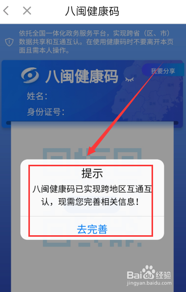 5、登录成功,提示“健康码已实现跨地区互通,需要完善信息”,点击“去完善”。