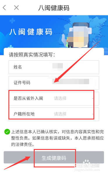6、完善信息界面,选择是否从外省入闽和户籍所在地,勾选同意协议,点击“生成健康码”即可。