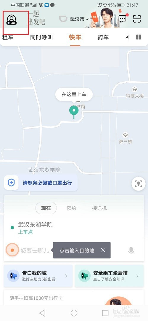 1、第一步打开滴滴出行,点击左上方的头像,如下图所示: