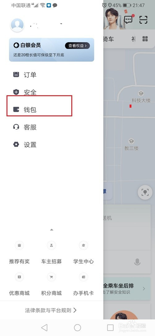2、第二步打开滴滴出行侧边栏之后,选择钱包,如下图所示: